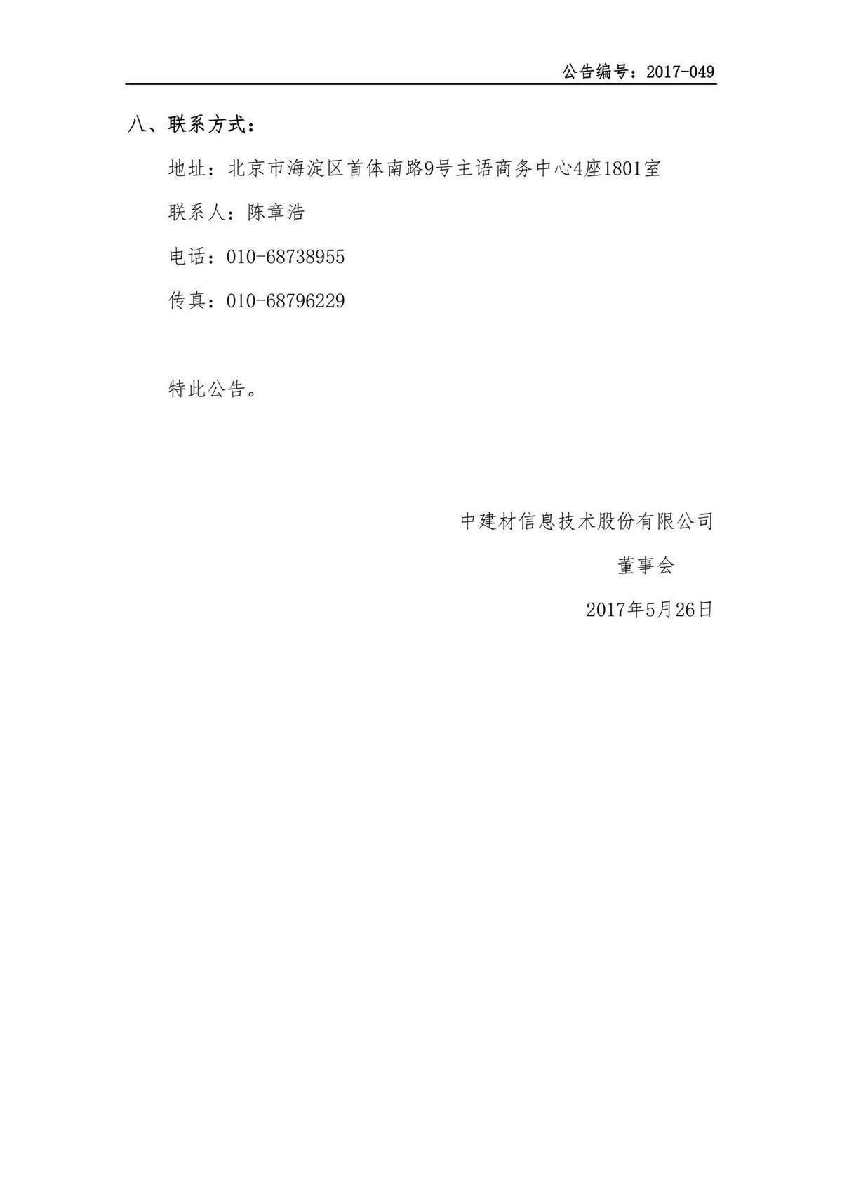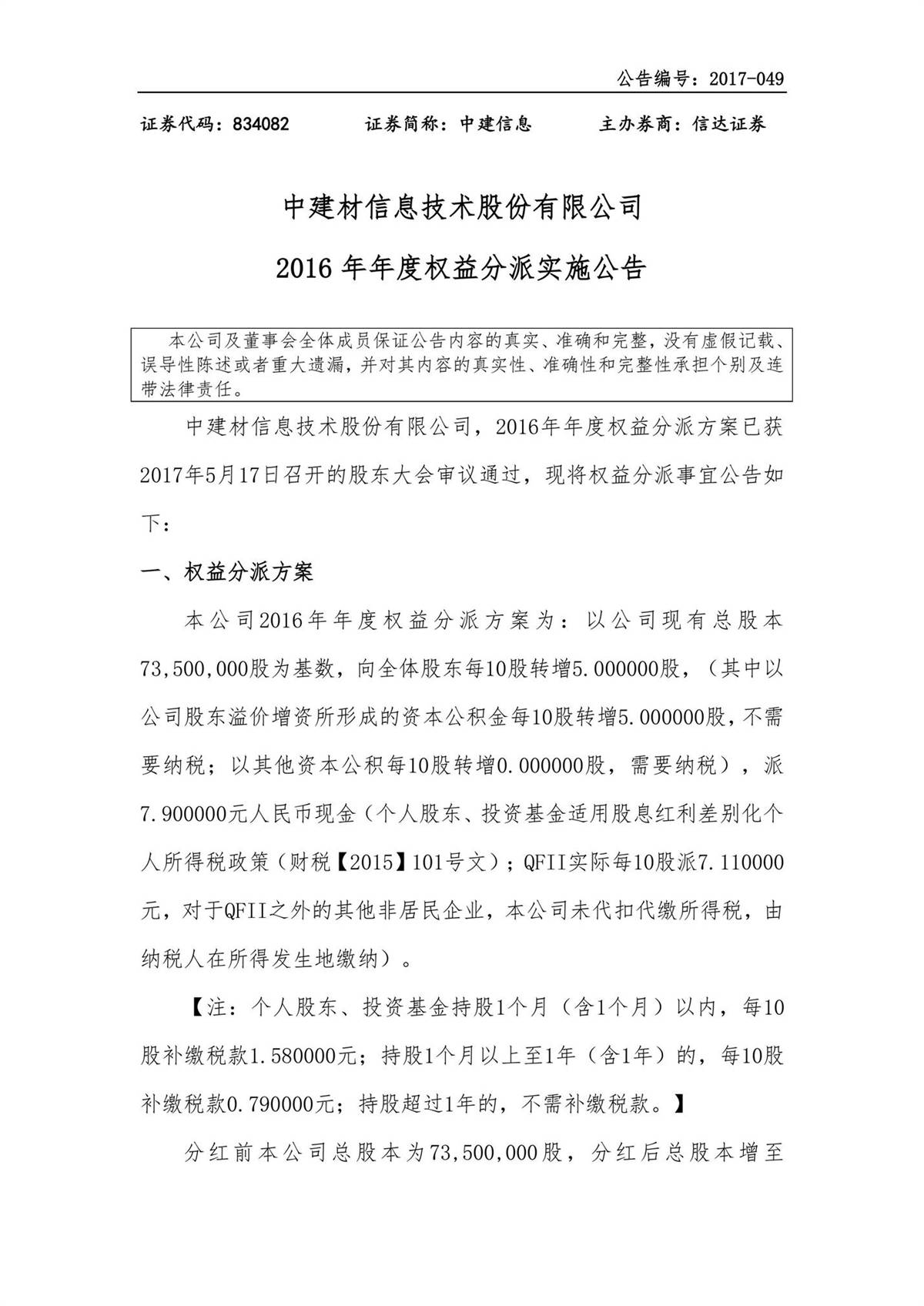 中建信息2016年年度權(quán)益分派實(shí)施公告